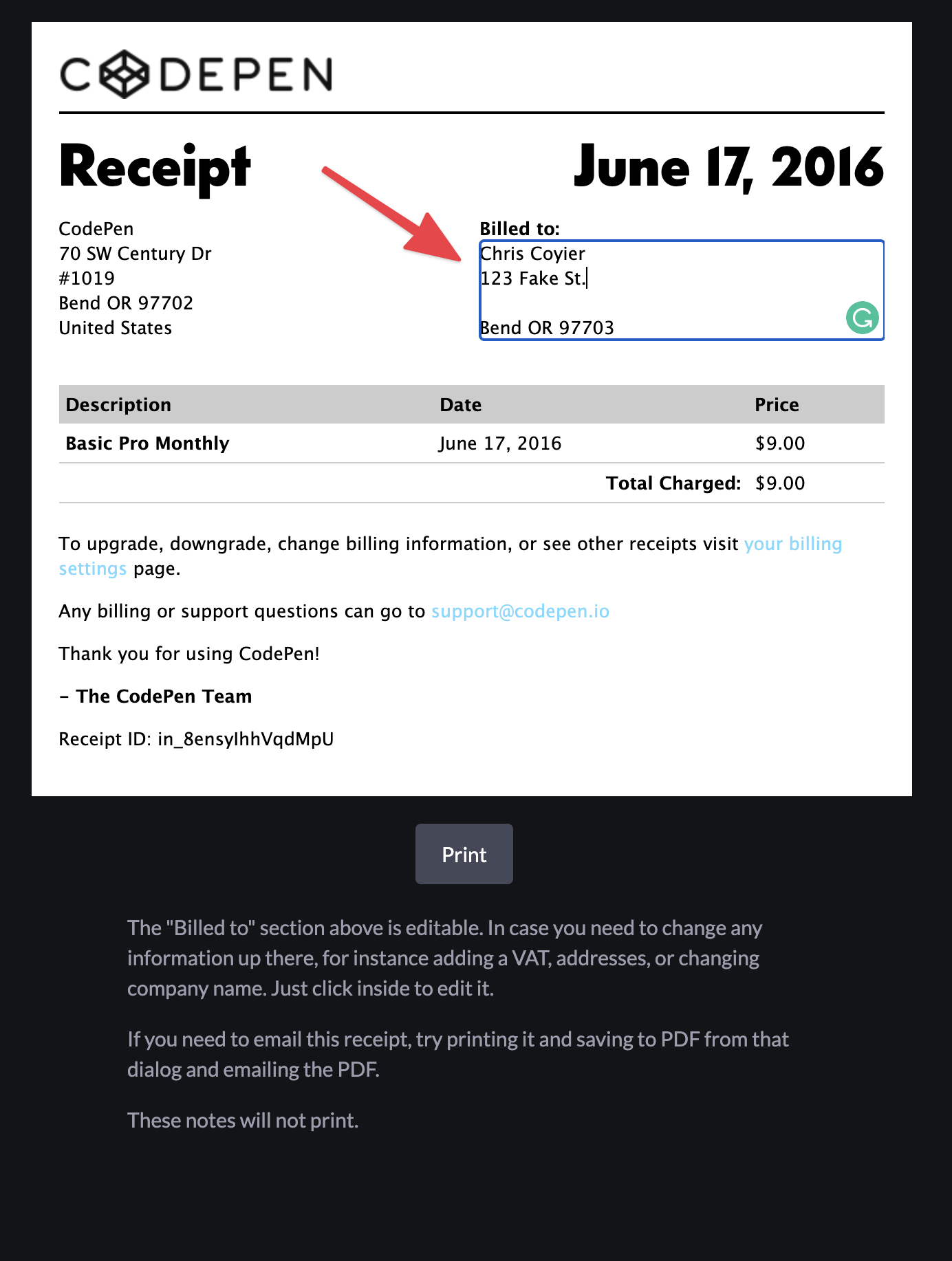 We don’t ask for your address when you sign up for CodePen PRO. We don’t need it, as we don’t need to send you anything and we don’t really adjust anything based on your location. But it’s entirely understandable that you might want your address on a receipt of purchase. We get that request all the time. Now, rather than any sort of work-around, we allow you to enter an address that we’ll use for putting on those reciepts.