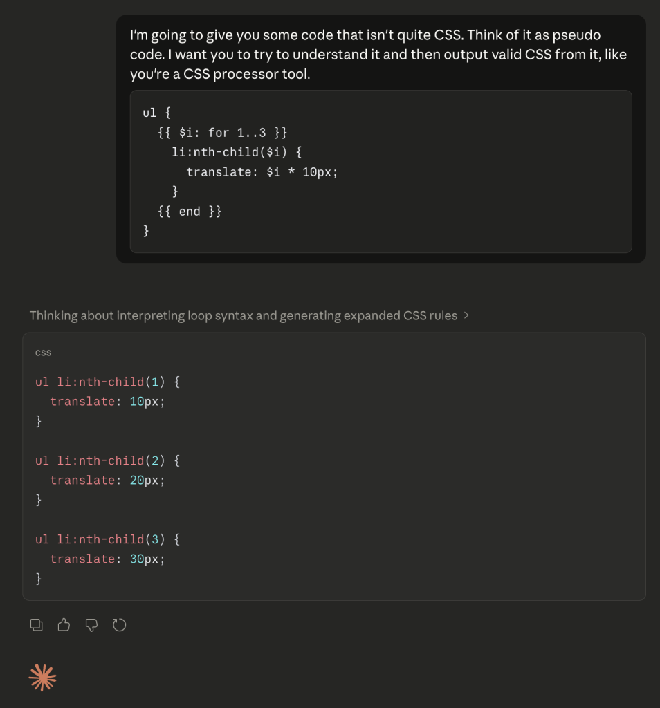 While considering build tools a bit, it feels like an interesting time to consider if AI could be (replace?) a build tool. Here’s an example. RIGHT THIS SECOND can you remember how to write a loop in Sass code? Or is it something you gotta look up? If you’re like me, I always try to find a reference to look at (often times Pens of my own I know I have sitting around).