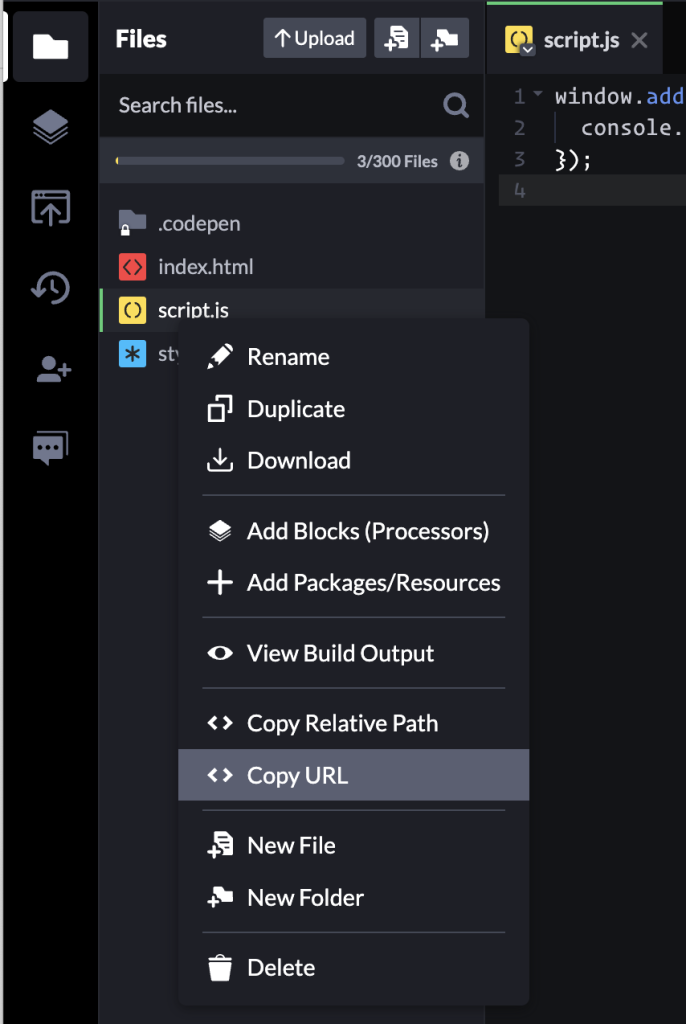 While this works for any file on any Pen, the Content-Type header for the served files will be text/plain. This means that files linked up as CSS, JavaScript, or media may not work correctly used off CodePen.