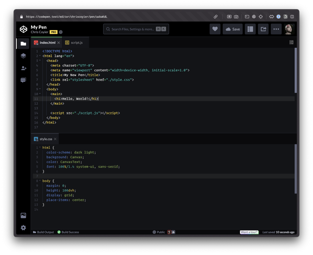 The Editors area can have up to three tab groups. On a default Pen, all three areas are open. One contains index.html, one contains style.css, and one contains script.js. But you could combine them all into a single editor area with tabs by dragging them there: